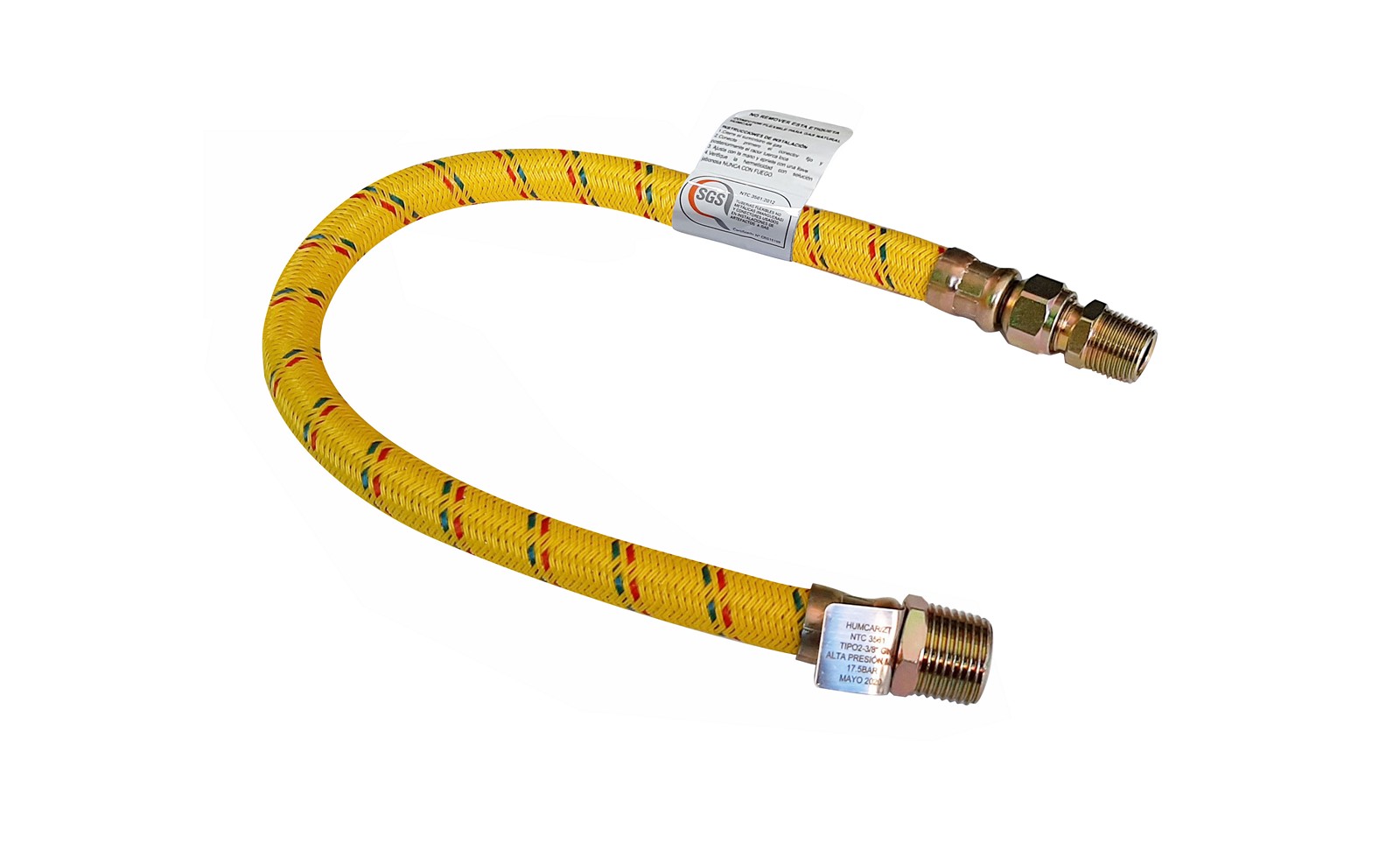 Conector utilizado en instalaciones de artefactos a gas que utilicen GLP (fase vapor), aire con mezcla de gas propano o gas natural. Compuesto por una manguera de PVC de alta resistencia a los agentes químicos del gas y conexiones de acero 12L14 con recubrimiento superficial. Temperatura de operación hasta 50ºC. Certificado bajo norma: NTC-3561.