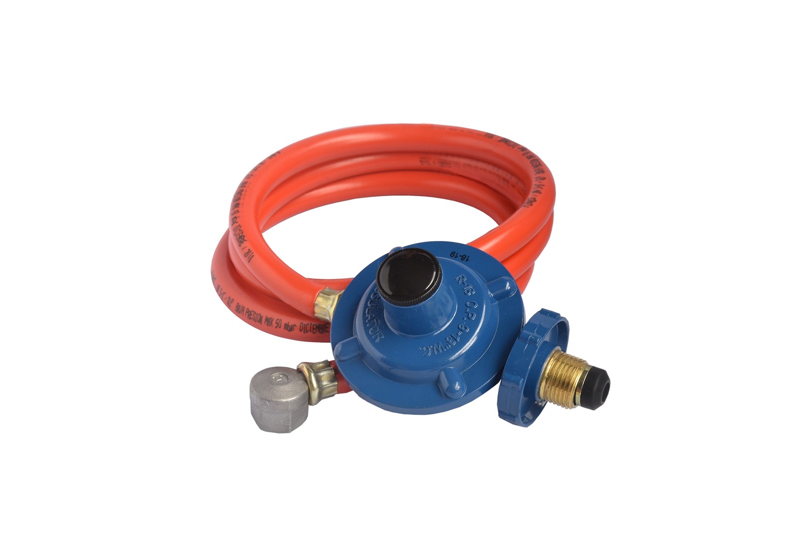 Regulador R18 Acción Directa Única Etapa GLP 28 mbar Volante 7/8 NGO x Mang 1,5m T1 con codo 3/8 NPTh 30203 BTU/h GLP